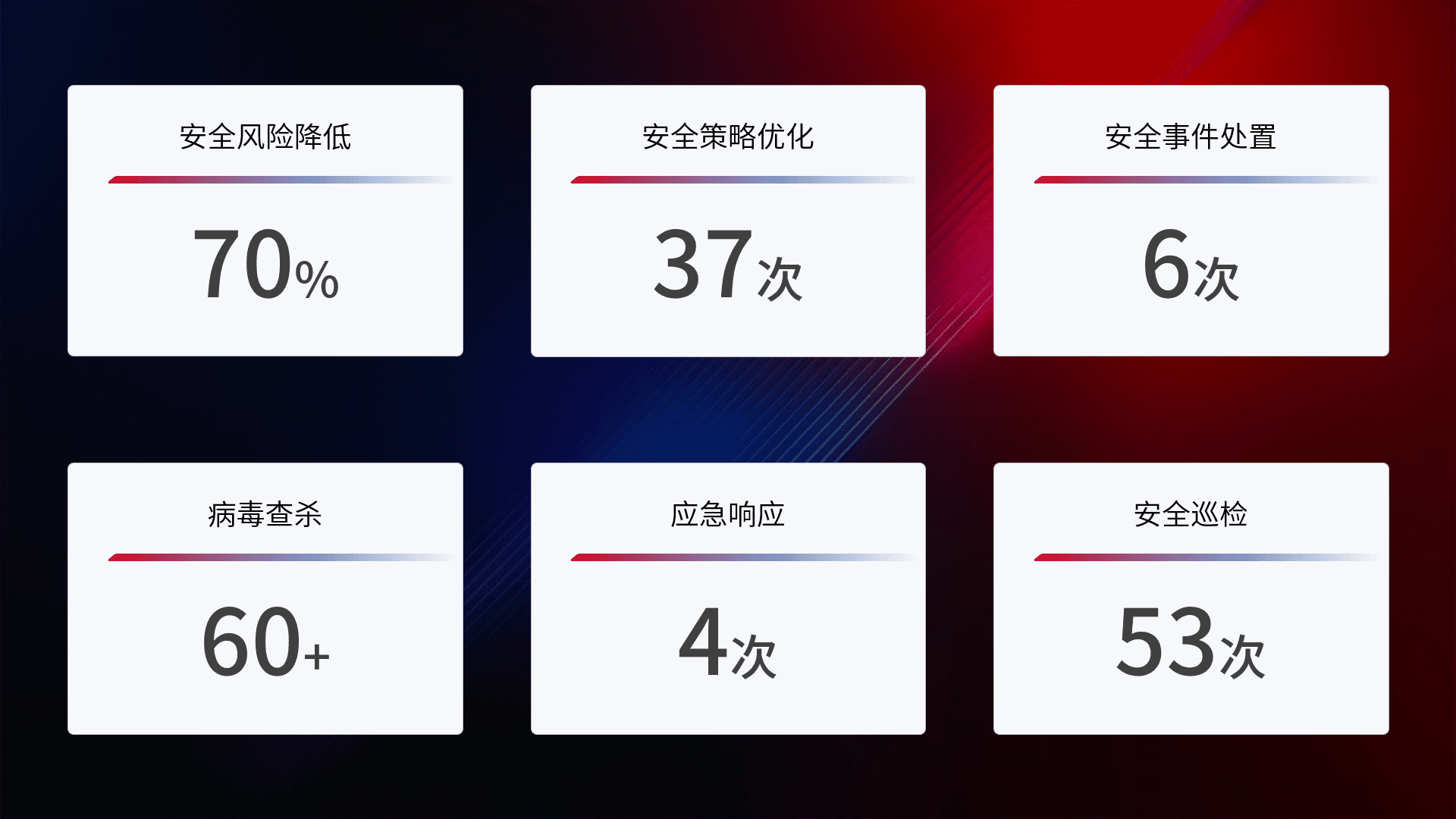 提供全面的安全事件报告体系,,,包括处置报告、、、、周报、、季度和年度总结,,结合持续监控,,帮助客户深入了解网络安全状况。。。