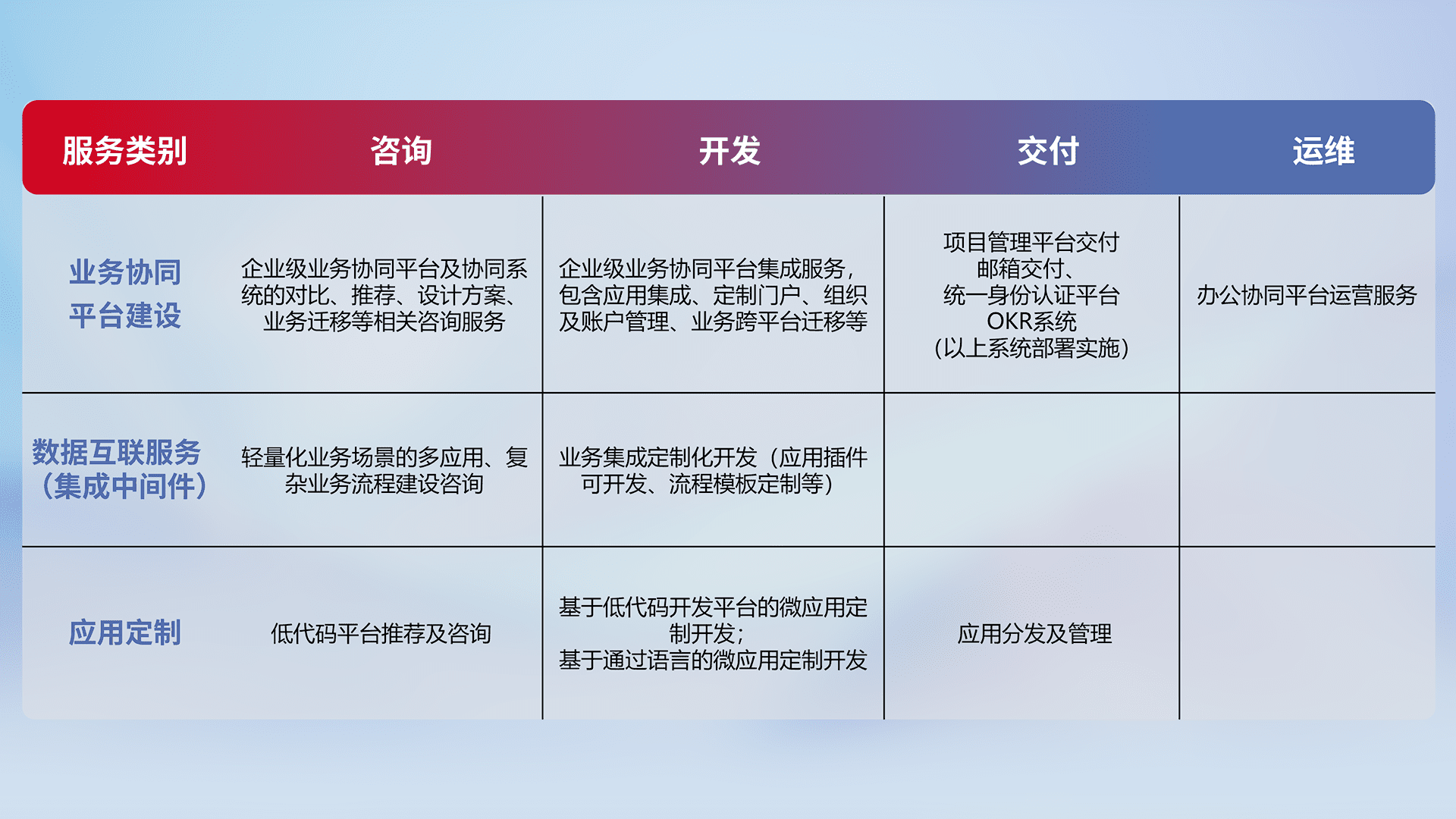 针对钉钉、、、企微、、IDaas等平台级产品提供产品的规划、、、方案、、交付、、、定制化开发等服务,,实现如统一协同办公、、智能客户服务、、混合会议管理、、、智能数据查询、、、、等业务场景,,,实现数字化转型。。。